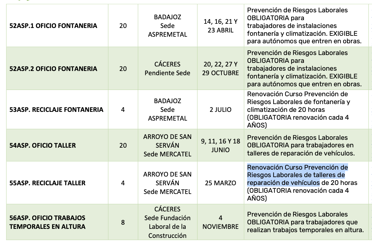 Cursos que tendrían un elevado coste económico pero que son GRATUITOS al estar subvencionados por la Junta de Extremadura. Algunos de ellos son obligatorios para trabajadores, para acceder a obras o se han de renovar cada cuatro años.