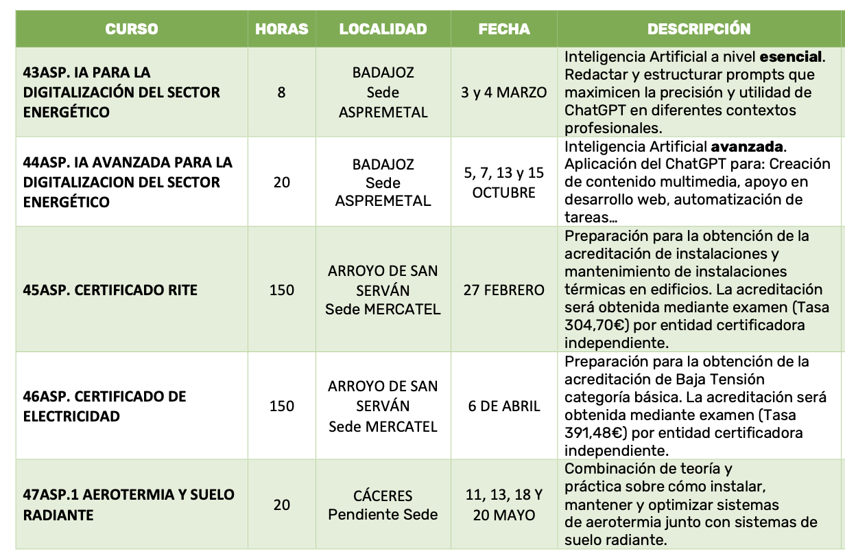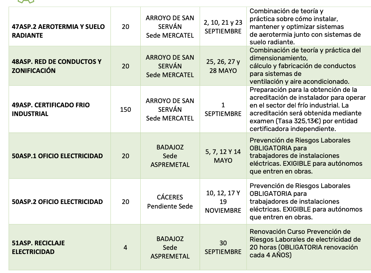 Aquí podéis descargar el calendario completo de cursos del metal que organiza Aspremetal dentro del marco formativo del programa PAF26. Este año se incluyen de nuevo cursos de preparación para la obtención de certificados de cualificación profesional (baja tensión, clima -RITE- o frío industrial), cursos técnicos (cálculo de instalaciones de suelo radiante con aerotermia o cálculo y fabricación de conductos), genéricos (básico y avanzado de inteligencia artificial, tan de actualidad y necesarios) o de prevención de riesgos laborales (obligatorios para trabajadores y muy aconsejables para autónomos, ya que pueden ser requeridos para entrar en obra).