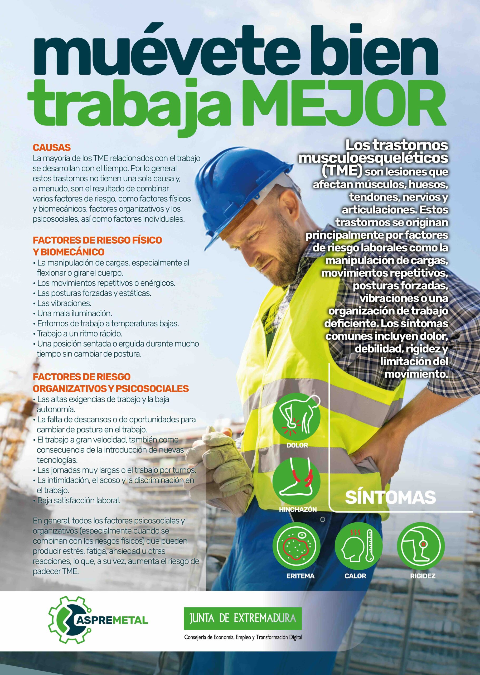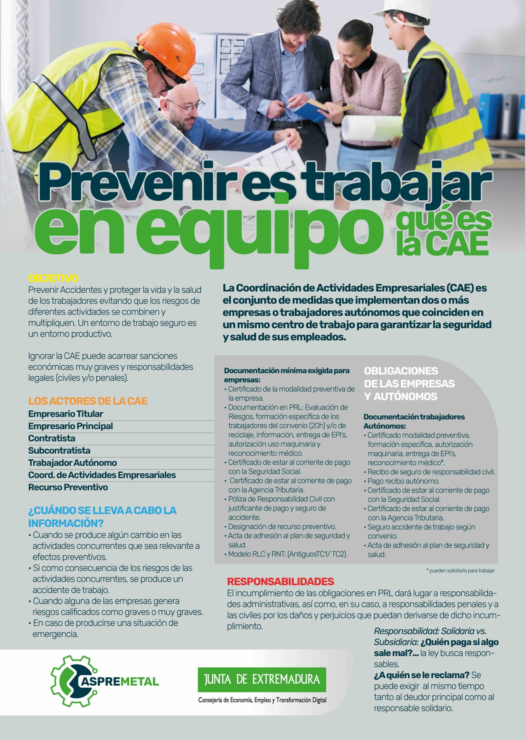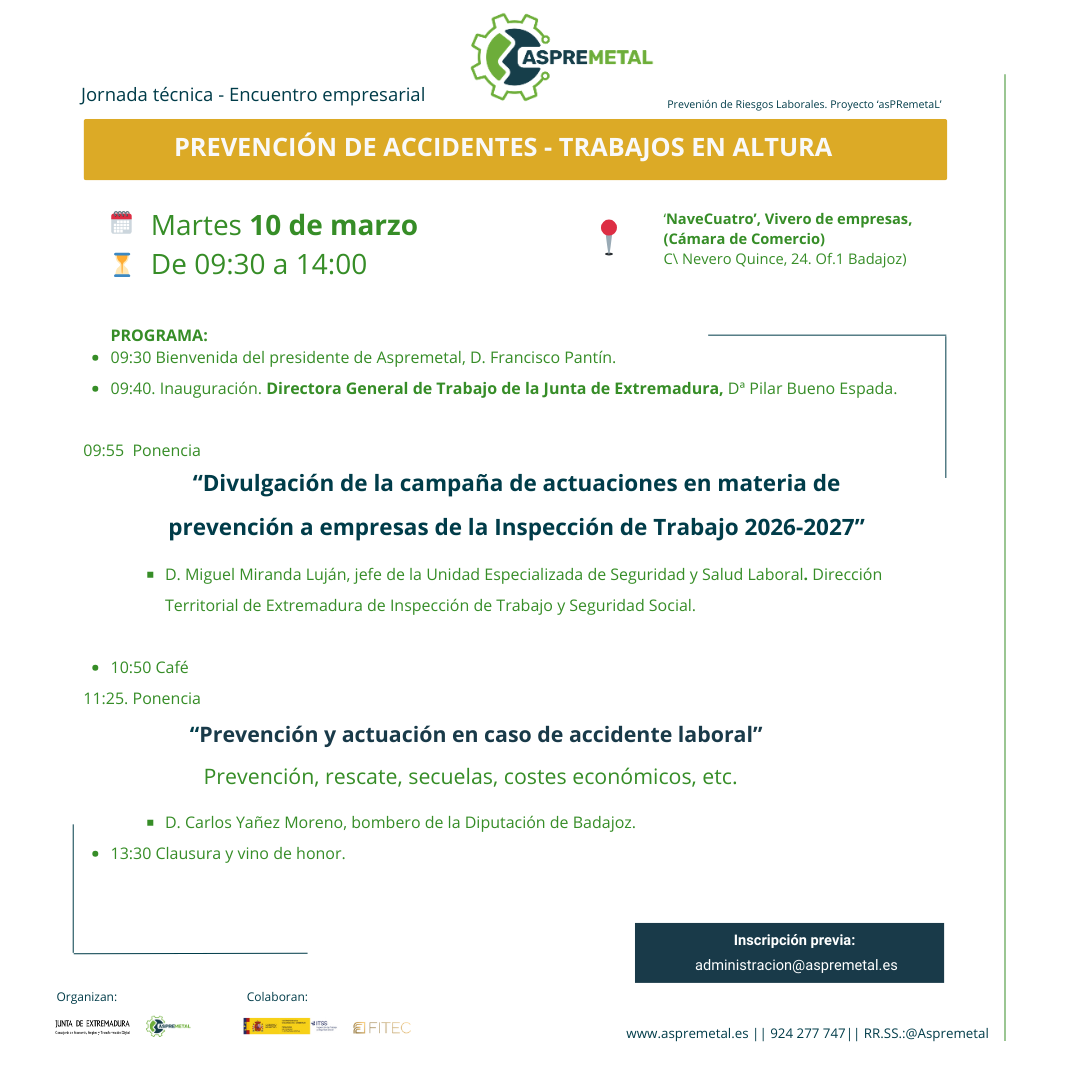 Aspremetal, en colaboración con la Dirección General de Trabajo y la Consejería de Economía, Empleo y Transformación Digital de la Junta de Extremadura, hemos puesto en marcha diversas medidas en materia de prevención de riesgos laborales para las empresas y profesionales del meta en nuestra región enmarcadas en el proyecto ‘asPRemetaL’. Desde talleres, a campañas de comunicación y creación de oficinas técnicas de asesoramiento. Todo cuenta para concienciar y ayudar a las empresas y trabajadores a crear entornos de trabajo más seguros.